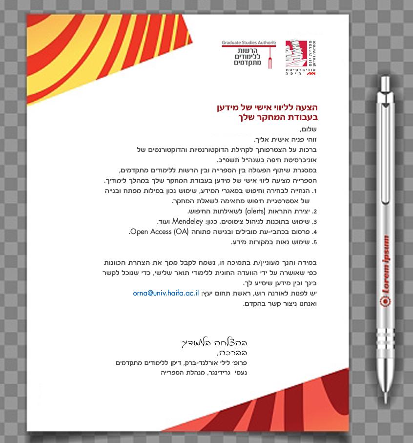 הספרייה מציעה ליווי אישי לדוקטורנטיות ולדוקטורנטים בעבודת המחקר במהלך כל תקופת הלימודים. לפרטים נוספים יש לפנות לאורנה רוש, ראש תחום יעץ orna@univ.haifa.ac.il