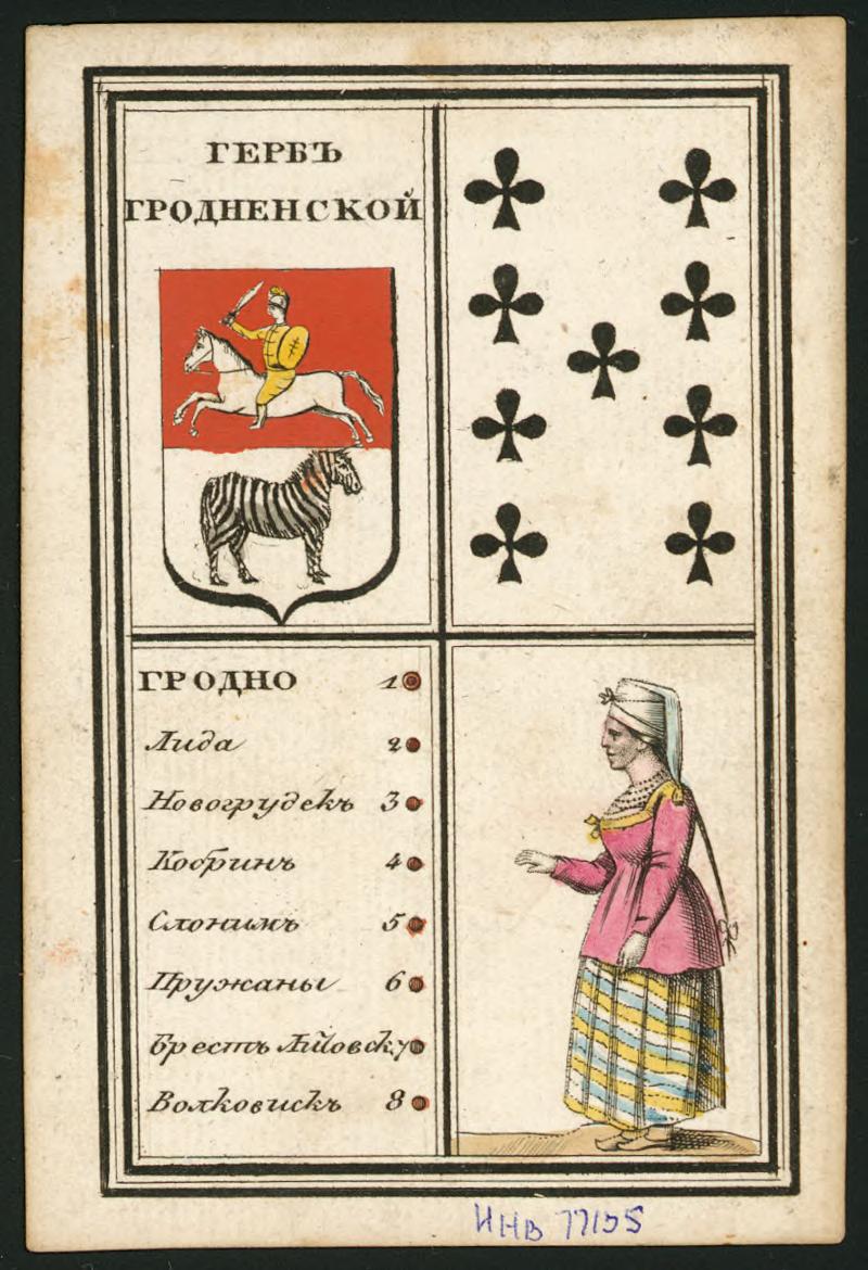 Playing card showing map and attributes of the Grodno Governorate. Illustrated by K. M. Gribanov, 1800. Library of Congress Online Catalog.