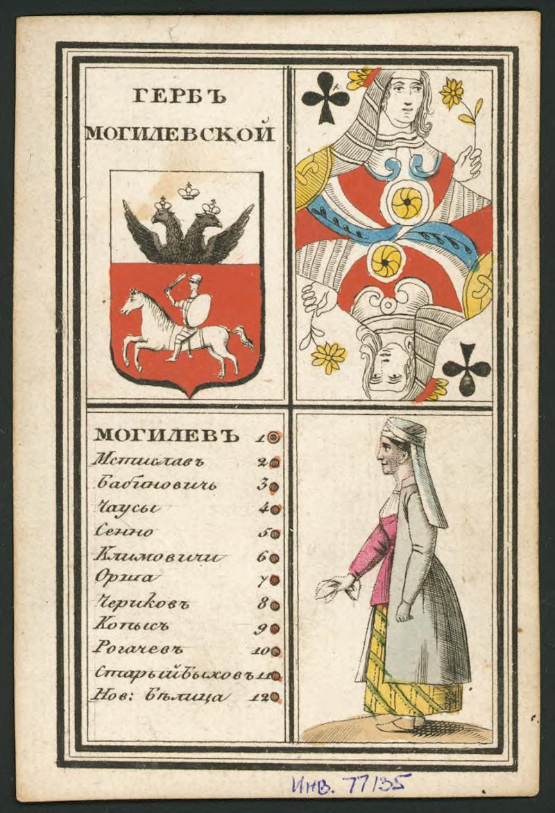 Playing card showing map and attributes of the Minsk Governorate. Illustrated by K. M. Gribanov, 1800. Library of Congress Online Catalog.