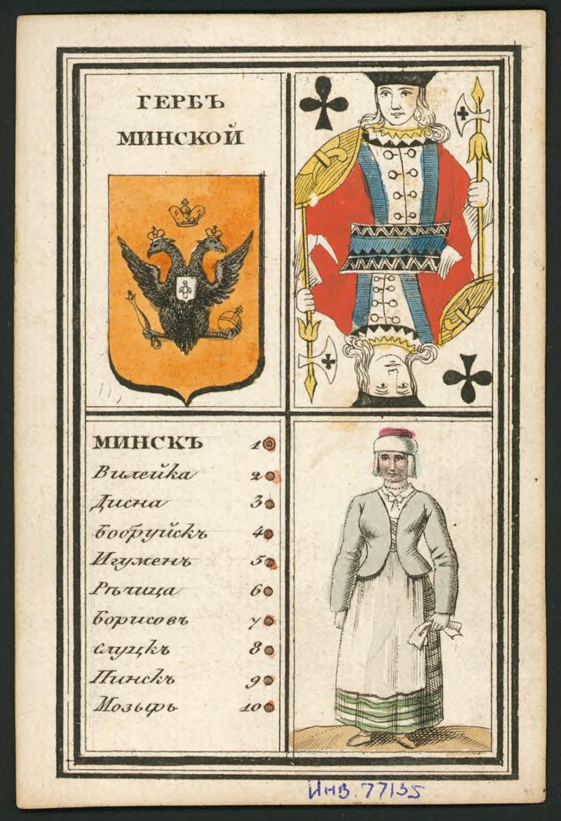Playing card showing map and attributes of the Minsk Governorate. Illustrated by K. M. Gribanov, 1800. Library of Congress Online Catalog.